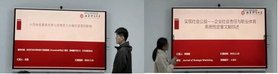 在文献速递环节,石磊分享了“小型体育赛事对参与者推荐主办城市意愿的影响”研究。该研究聚焦于非顶级赛事的经济与社会溢出效应,探讨了赛事体验、情感联结与城市品牌传播之间的转化机制,为地方城市依托小型体育赛事撬动旅游与经济发展提供了微观层面的实证依据。宋瑞雪则带来题为“实现社会公益——企业社会责任与职业体育:系统性定量文献综述”的分享。研究成果系统梳理了职业体育组织履行企业社会责任的多维路径,量化分析了其在提升组织合法性、增强球迷忠诚度及促进社区发展等方面的积极效应,揭示了职业体育超越竞技本身、实现社会公益价值的逻辑链条。
