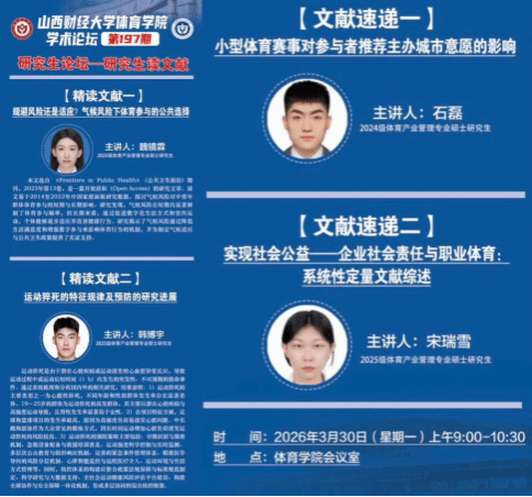 3月30日上午,博彩平台 第197期学术论坛——研究生读文献活动在博彩平台 会议室顺利举行。本期论坛由博彩平台 学科与研究生办公室主任王雁副教授主持,全体研究生到场参与。2025级研究生魏镜霖、韩博宇两位同学进行了文献精读分享,2024级研究生石磊、2025级研究生宋瑞雪两位同学进行了文献速递,围绕气候风险下的体育参与、运动猝死防控、小型体育赛事城市品牌效应及职业体育社会责任等热点议题展开深入研讨,现场学术氛围浓厚,思想碰撞热烈。