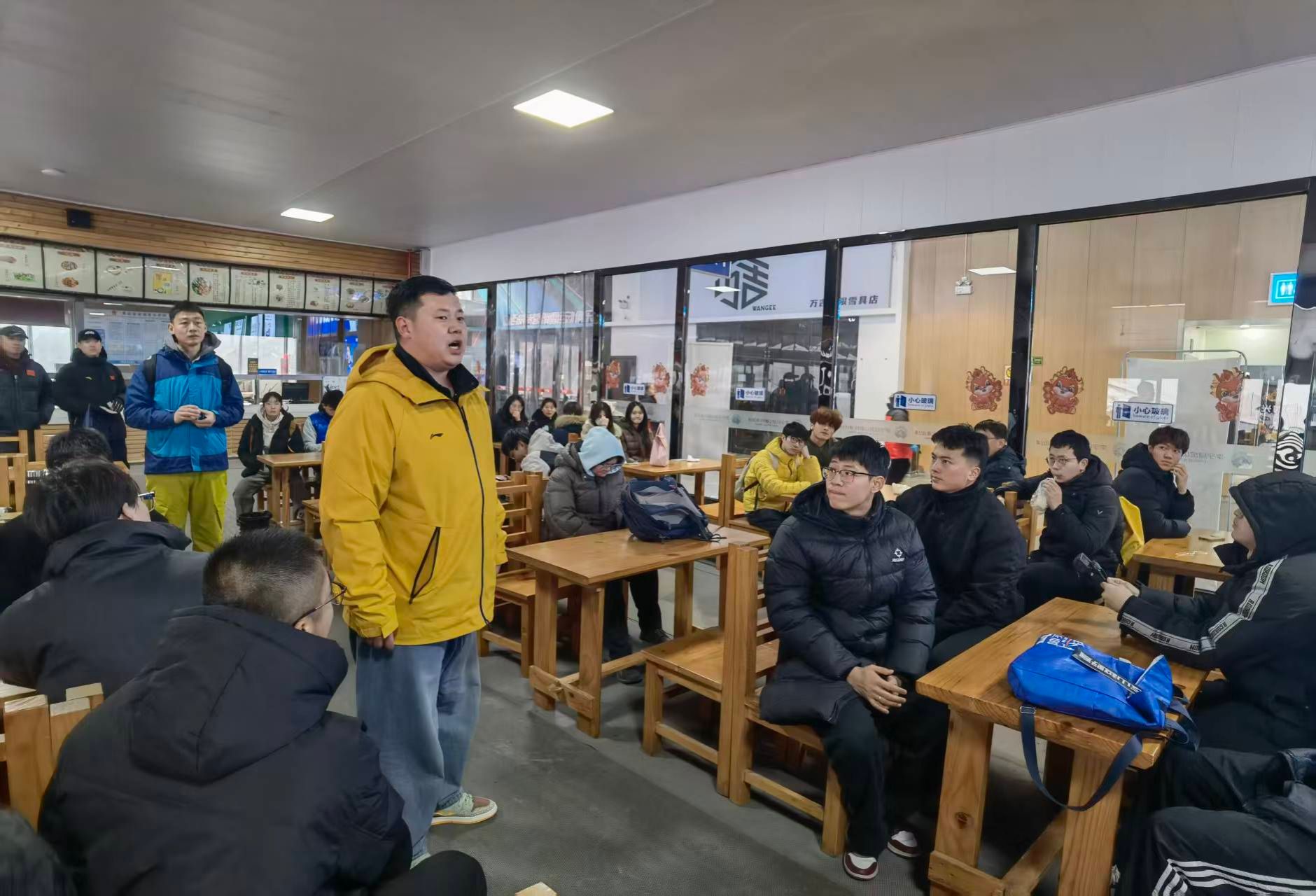 活动伊始,师生听取了李宁乌金山国际滑雪场运营部梁经理对国内冰雪运动产业发展状况以及李宁乌金山国际滑雪场运营状况的介绍,他详细阐述了冰雪运动产业的发展潜力与人才需求,鼓励同学们珍惜实践机会,将专业知识转化为服务行业发展的实际能力。