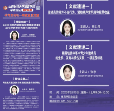 3月16日上午,博彩平台-最大博彩平台 第194期学术论坛——研究生读文献活动在博彩平台 会议室如期举行。本次论坛主题聚焦体育产业管理领域前沿研究,四位研究生代表依次登台分享经典文献成果,为全院师生搭建了学术交流与思想碰撞的优质平台。