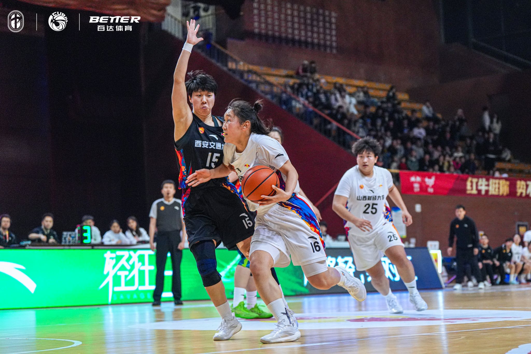 进入第二节,我校女篮针对性加强外线防守,同时利用灵活突破与中距离投篮打开进攻节奏,单节打出16-12的比分,成功将分差大幅缩小。这一节里,姑娘们用严密的防守限制了对手的进攻火力,也用一次次精准的出手向对手发起反击,让现场观众看到了山财女篮的调整能力与不服输的拼劲。
