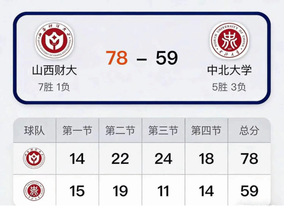 2026年3月30日,山西财经大学男子篮球队对阵中北大学男子篮球队,最终以78-59的比分战胜对手。以7胜1负的战绩锁定赛区第 5 名,结束本次西北赛区征程。